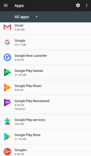 - Qui dall’elenco, cerca Google Play Services o Google Play Store e fai clic su di esso