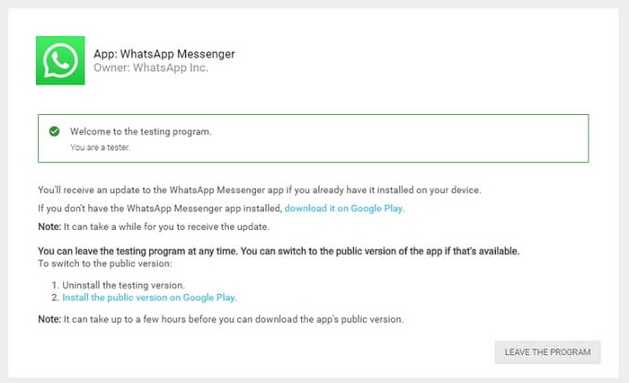 Quando si verifica continuamente lo stesso problema, è necessario iscriversi al programma beta di WhatsApp. Questo ti aiuterà a testare eventuali nuovi aggiornamenti prima che vengano rilasciati pubblicamente. Ma se stai utilizzando la versione beta di WhatsApp, gli utenti potrebbero riscontrare che il backup della chat di WhatsApp è bloccato.