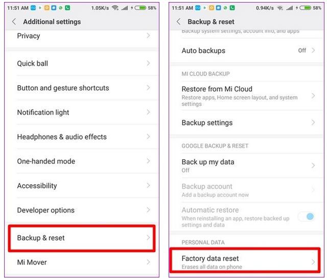 Alla fine, quando nulla funziona per te, è ora di andare duro ora. Per questo, devi formattare il tuo dispositivo, ma ricorda di fare un backup di esso. Successivamente, segui i seguenti passaggi per eseguire il ripristino dei dati di fabbrica: